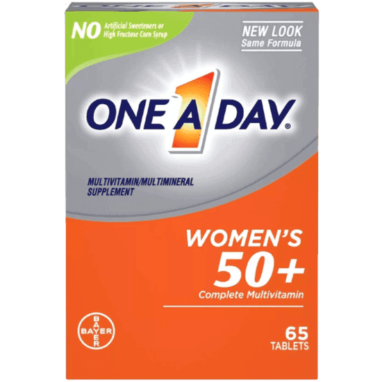 To support aging concerns, One A Day Women’s 50+ Multi combines vitamins A, C, E, and B-complex with zinc and calcium for heart and brain function.