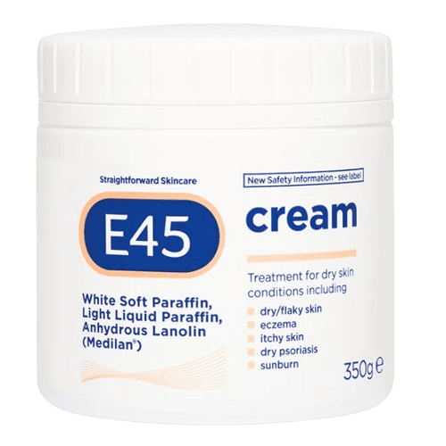 E45 Moisturizing Cream (350g) is a rich face-and-body cream that deeply hydrates very dry skin, soothes irritation, and restores softness.