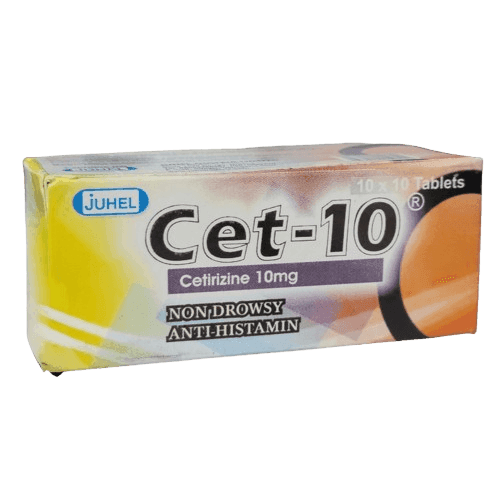 Juhel Cet-10 Cetirizine 10mg contains cetirizine hydrochloride. It provides effective relief from hay fever, seasonal allergies, and skin hives.