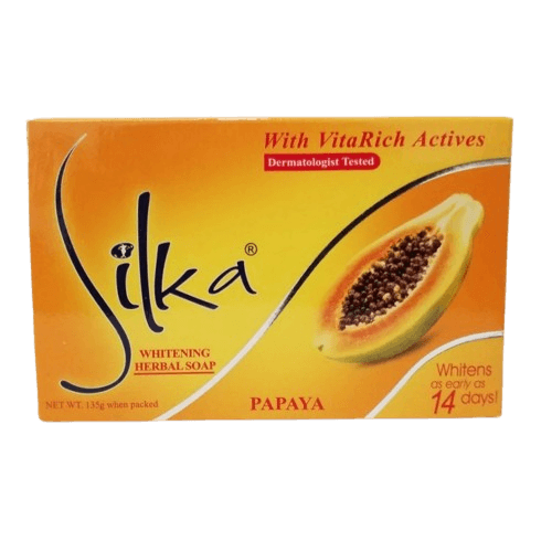 Silka Papaya With VitaRich Actives, 135g is a brightening soap that gently exfoliates and nourishes the skin for a healthy glow.