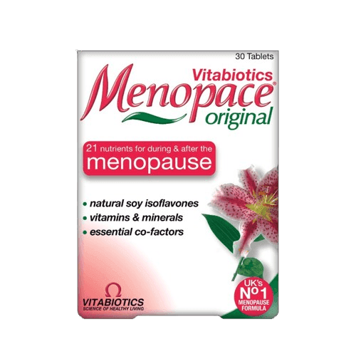 To support hormonal balance and vitality, Vitabiotics Menopace provides soy isoflavones and vitamins B6, B12, and D for health during menopause.