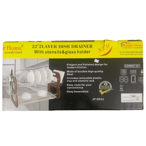 Wonder Home 22″ 2-Layer Dish Drainer with Utensils & Glass Holder is a durable, polished steel double-layer rack with removable trays and side holders for organized, efficient kitchen drying.